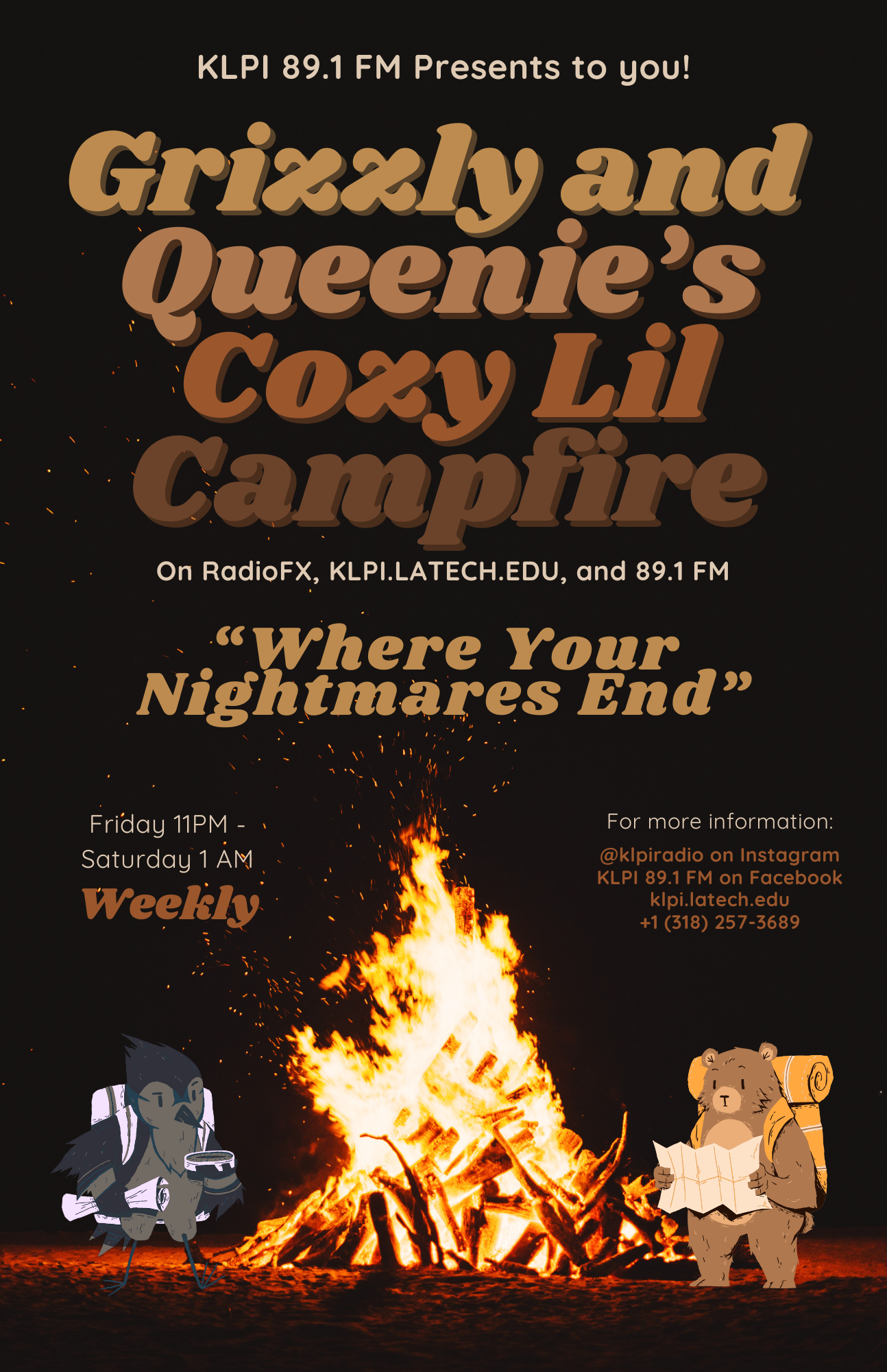 Come relax with Grizzly and The Crow Queen around the campfire and find the place where your nightmares end. We play a variety of folk, indie rock, and generally whatever we feel fits the vibe for a comfortable or existential kind of night.